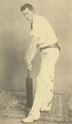 In 1901 Bernard Bosanquet brought an English team to Philadelphia. The four match series ended tied.[23] The Philadelphians again toured England in 1903, playing 15 first-class games. The team was more successful than in 1897, this time winning six, losing six and drawing three. Bart King continued his successful form on this tour. In the first innings against Lancashire, he bowled 27 overs and took 5 wickets for 46 runs. After the Philadelphians surpassed Lancashire, their lead was quickly wiped away in the second innings. With the wind strong over King’s left shoulder he went in to dominate the opposition. In his first over after the lunch break, he yorked one of the opening batsmen and his replacement with successive balls. In the second over he clean bowled two more batsmen, and in the third he bowled a stump out of the ground. He had taken 5 wickets for 7 runs. After this performance, King had to be rested in the field and one wicket was taken. On his return, he took four more to finish with 9 for 62. The Philadelphians won next morning by nine wickets.[24] The tour of England was followed the same year by a visit from Kent to Philadelphia. The Marylebone Cricket Club visited for two tours in 1905 and 1907. The first series was drawn one game to one,[25] and the second tour saw both games drawn.[26]