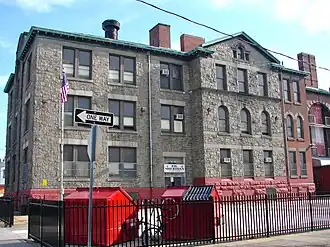 Built between 1899 and 1900, this historic structure is a three-story, five-bay, stone-and-brick building that was designed in the Colonial Revival style. It features a stone entrance pavilion, Palladian windows, and large arched openings. Three-story wings were added 1902 and 1910.[3]