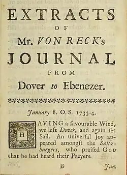 - ^ Reck, Philipp Georg Friedrich von. An extract of the journals of Mr. Commissary Von Reck, who conducted the first transport of Saltzburgers to Georgia: and of the Reverend Mr. Bolzius, one of their ministers. Giving an account of their voyage to, and happy settlement in that province. Pub. by the direction of the Society for Promoting Christian Knowledge. London, Printed by M. Downing, 1734.