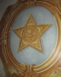The Philomathean Hall is the oldest building[20] in the Erskine College-Due West Historic District. As such, it is a contributing property in the National Register of Historic Places.[21] It was constructed in 1859, under the direction of architect Thomas Veal. The building was constructed in the Italian Renaissance Revival style. The two-story stuccoed building features Corinthian pilasters, a pedimented pavilion, recessed balustrades, and a Palladian window.[22] The Hall demonstrates the influence of Andrea Palladio as it bears close resemblance to the Villa Capra "La Rotonda" and the Villa Porto (Vivaro di Dueville). Palladio's geometrically formulaic design is echoed in the Philomathean Hall's 50x40 footprint, symmetrically placed windows, and interior floor plan that conforms to the window's exterior placement. The open second-floor meeting hall celebrates this geometry with its painted high ceiling, flanking fireplaces, and 14 symmetrically placed windows, while the downstairs rooms are dimensioned to match the window placement, a schematic that still challenges contemporary architects. The architectural similarities between the Hall and colonial American buildings, such as those at Mount Vernon, Monticello, and the White House, are thematic of the early 19th century.[23] Additionally, the Hall is aesthetically tied to other South Carolina buildings. It possesses characteristics similar to those found in Hibernian Hall and Drayton Hall. Leaks in the internal gutter have caused significant damage to the jewel-box painting on the ceiling of the great hall on the second floor, which was added in the 1912 J.J. Darlington renovation.[24][25] The ceiling and wall frescoes were painted by Italian painter Alfredo Lanzer.