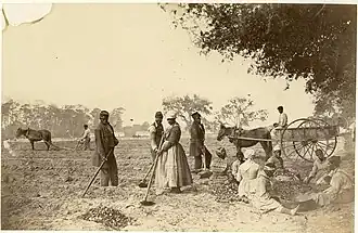 John Reekie (1829–1885) was another little known Civil War photographer. A Scotsman, Reekie was employed by Alexander Gardner. Reekie was active in Virginia, taking views at Dutch Gap and City Point, and in and around Petersburg, Mechanicsville and Richmond. Reekie's probably best known for his scenes of the unburied dead, on the battlefields of Gaines' Mill and Cold Harbor. One of his most well-known, "A Burial Party, Cold Harbor," was included with six others of his negatives in Gardner's Photographic Sketch Book of the War. It depicts African American soldiers gathering human remains on the Cold Harbor battlefield, almost a year after the battle.[48] This photograph is notable for being one of relatively few images depicting black soldiers at work in the war.[49]