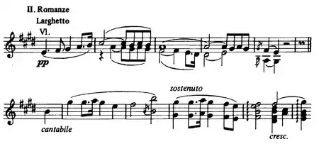 The Romanze, although not strictly in sonata form, has its second theme of the exposition ascribe to the classical model of modulating to the dominant (I-V), and, when it returns, it modulates to the mediant (III). Chopin wrote in the same letter to Tytus, saying "It is not meant to create a powerful effect; it is rather a Romance, calm and melancholy, giving the impression of someone looking gently towards a spot that calls to mind a thousand happy memories. It is a kind of reverie in the moonlight on a beautiful spring evening".[11] The second movement has been described as "unashamedly heart-on-your-sleeve stuff".[12]