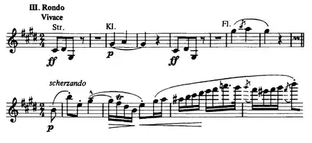 Written with much procrastination, hesitation, and difficulty, the third movement features Krakowiak rhythms, a syncopated, duple-time popular dance in contemporary Kraków.[13] It became one of the last pieces written by Chopin before the political turmoil in Poland that prevented him from returning. After completing the Rondo in August 1830, he played it privately—first with a string quartet and then a small orchestral ensemble.