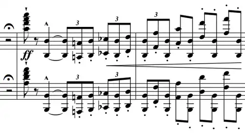 The orchestra introduces the main theme of the piece with a powerful motif.[3] A story exists that, to mock his critics, Liszt and his son-in-law, Hans von Bülow, put the words Das versteht ihr alle nicht, haha! (none of you understand this, ha-ha) to the notes of the opening two bars.[4] The piano then comes in with an octave passage, spanning four octaves. A duet ensues between the piano and the clarinet in a quiet and peaceful passage, which is soon taken over again by the main theme. Following this, the piano plays fast, downward chromatic octaves, before recapitulating a section from earlier in the movement, this time in G major. The movement finishes with the main theme played by the strings while the piano imitates a harp with fast, quiet arpeggios, culminating with an upwards chromatic scale in sixths, diminishing to ppp volume.