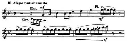 After a brief general pause, the whole orchestra resumes, again playing the same theme. Then a cello plays the theme while the piano answers hurriedly with a developmental recitative section. This leads into a passage where solos in the woodwind section play a new theme while the piano plays long trills in the right hand and spread chords in the left. The passage is ended by the piano and clarinet in duet.
