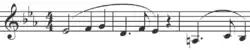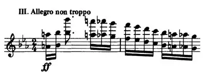 - The second movement is in E major and is in 3/4 time. The movement is feverish and slow. The main theme is presented in the orchestra and varied and developed throughout the movement. The movement continues without pause into the third movement. It lasts about 7 minutes.