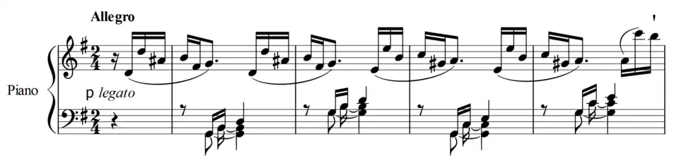 Like the first movement, the third movement opens with an ascending, hesitant, three-note motif that conveys considerable rhythmic ambiguity. In his book, The Music Instinct, the science writer Philip Ball[2] singles out this theme as an example of the classic trick of disguising 'one rhythmic structure as another'. The movement, which is in 3