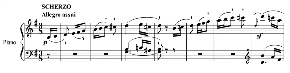 8 time, is a Scherzo in rondo form. The main theme undergoes many changes, until the end, where it ends quietly, on the very lowest notes of the piano of Beethoven's time. The movement plays with listener expectations through rhythmic ambiguity, unexpected harmonic shifts, and above all, the use of strategically placed silences. All of these characteristic examples of musical wit show the continuing influence of Haydn on Beethoven at this early stage in his composing career.