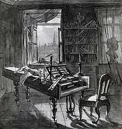 There is an April entry in Beethoven's conversation book describing a "small new piece" that is, according to William Meredith, identical to the first movement of Op. 109. In fact, the outline of the movement makes the idea of a Bagatelle interrupted by fantasia-like interludes seem very plausible.[2][3] Beethoven's secretary Franz Oliva then allegedly suggested the idea of using this "small piece" as the beginning of the sonata that Schlesinger wanted.[4] Sieghard Brandenburg has put forward the theory that Beethoven had originally planned a two-movement sonata, omitting the first movement. Apparently some of the motivic characteristics that link the first movement with the others were only introduced later.[5] Alexander Wheelock Thayer, on the other hand, put forward the view that the beginning of a sonata in E minor by Beethoven was not developed further and had nothing to do with Op. 109.[6]