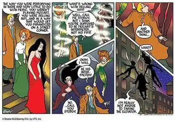 Titans would have been a gag-a-day format strip, in which Pibgorn (named Oola Inch here), disenchanted with her expected role as a fairy, usually would break away from her regular routine to wax philosophical. Unfortunately, Oola was also one of life's losers, her dialogues often resulting in misfortune, such as having a Magic 8 Ball roll over her, or nearly being eaten by whatever animal she's conversing with (a spider, a duckling, etc.). The strips also showed a darker side to her character, as in addition to managing dewdrops, her responsibilities include serving as the "voices-in-my-head" of disgruntled government employees, driving one to attempted homicide on at least one occasion.