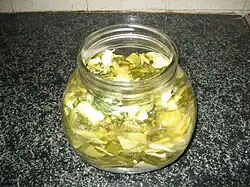 In traditional pickling, fruit or vegetables are submerged in brine (20–40 grams/L of salt (3.2–6.4 oz/imp gal or 2.7–5.3 oz/US gal)), or shredded and salted as in sauerkraut preparation, and held underwater by flat stones layered on top.[46] Alternatively, a lid with an airtrap or a tight lid may be used if the lid is able to release pressure which may result from carbon dioxide buildup.[47] Mold or (white) kahm yeast may form on the surface; kahm yeast is mostly harmless but can impart an off taste and may be removed without affecting the pickling process.[48]