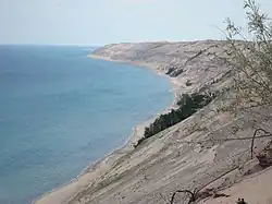 The Grand Sable Dunes, at the eastern end of the Lakeshore, are a perched dune formation. Sand washed ashore by wave action was then blown upslope by northerly prevailing winds until it came to rest atop a glacial moraine. The Grand Sable Dunes today form a five-mile-long sand slope that rises from Lake Superior at a 35° angle. The summits of the tallest dunes are as high as 275 feet (85 m) above lake level.