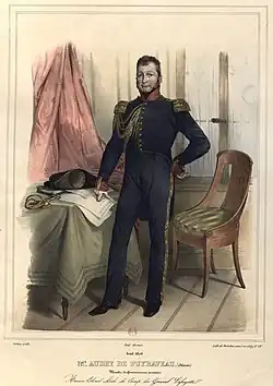 Seeing the indecisiveness of the deputies, Audry had a notice printed and displayed during the night that named General Lafayette as commander of the National Guard, and himself as the General's aide-de-camp. The next day, 29 July, he went to inform the general of his nomination. When the general hesitated, he managed to persuade him to come with him to the Laffite's house, where the deputies were meeting.[9] Carbonnel and Audry then went with the old general to the Hôtel de Ville, where he was welcomed and installed in command.[10]