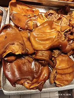 Pig's ear, as food for human consumption, is the cooked ear of pig. It is found in several cuisines around the world.