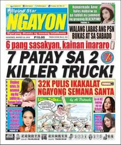Pilipino Star Ngayon, self-styled as Pilipino Star NGAYON and first known as Ang Pilipino Ngayon, is the leading tabloid newspaper of daily nationwide circulation in the Philippines.[2][3] It is written and published in Filipino, the national language of the Philippines. The tabloid newspaper is owned and operated by PhilStar Daily, Inc., under its subsidiary, Pilipino Star NGAYON, Inc.
