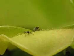 The diet will range depending on the taxonomy and size of the prey due to the plant's retention ability. These size limitations are known to be the main element influencing what prey sources this carnivorous plant can access.[11] They can also acquire nourishment from pollen and other plant parts that are high in protein, as other plants can become trapped on their leaves, thus, butterworts are both carnivorous and herbivorous plants.[7] The diet consists of several species from the arthropod taxa; the majority of their prey are insects that have wings and are able to fly. The luring, retaining, and seizing of prey is the first steps in the feeding procedure for carnivorous plants; the result of the process is absorption and digestion of nutrients sourced from these food supplies. Pinguicula species do not select their prey, as they passively accumulate them through methods of sticky, adhesive leaves. However, they do have the ability of visual attraction of their colorful leaves, which will increase the likelihood of luring and capturing a specific taxa.[12] Pinguicula capture their food source/ prey by means of the mucilaginous, sticky substances produced by their stalk glands on the top of their leaf. Once the prey has become trapped in the peduncular glands, the sessile glands present will then produce enzymes needed to accomplish digestion and breaking down the digestible regions of the prey for their nutrients; taking in the fluids of the food source by means of cuticular holes present on the leaf's surface.