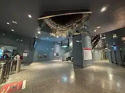The station has three levels: the entrances at street level, the two mezzanines just below them, and the train platform at the bottom. Enough space has been left between the surface and the platform to allow for the construction of an underground station for a future light rail transit line.[5]