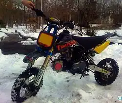 The pit bike evolved from custom-built motorized bikes that began appearing in the pit lanes of post-war 1940s and 1950s racing events. Initially, the term also applied to the use of bicycles or motorcycles used to navigate event staging areas. These hand-built machines were directly responsible for the creation of the minibike market.[1] The fairly cheap price and the mobility of minibikes made them easy to use and popular at racing events. As the minibike market boomed in the 1960s, Honda introduced the Z series, which became a popular choice to fill this role. With the popularity of off-road motorcycles increasing through the 1980s, the production of inexpensive, introductory-model motocross and dual-sport pit bikes began.