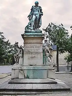 In the place in front of the main entrance to the hospital, there is a large bronze monument to Philippe Pinel, who was chief physician of the Hospice from 1795 to his death in 1826. The Salpêtrière was, at the time, like a large village, with seven thousand elderly indigent and ailing women, an entrenched bureaucracy, a teeming market and huge infirmaries. Pinel created an inoculation clinic in his service at the Salpêtrière in 1799 and the first vaccination in Paris was given there in April 1800.