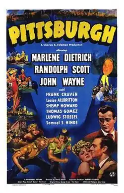 Pittsburgh is a 1942 American drama film directed by Lewis Seiler and starring Marlene Dietrich, Randolph Scott, and John Wayne.[2] Based on a story by George Owen and Tom Reed, the film is about an ambitious coal miner who values wealth and power in the Pittsburgh steel industry over his friends, lovers, and ideals, only to find himself deserted and alone at the top. When his fortune crumbles around him, he discovers that fate offers him an unexpected second chance. Filmed partially on location in Pittsburgh, Pennsylvania, the film co-stars Shemp Howard of Three Stooges fame in a rare dramatic role. Dietrich, Scott, and Wayne also made The Spoilers together that same year. Scott received top billing over Wayne in both films despite the fact that Wayne's roles were larger and more important.