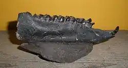 British palaeontologist Richard Owen in 1848 wrote about a nearly complete lower jaw with both deciduous and permanent dental sets that was uncovered from the Eocene beds of Hordle, England by Alexander Pytts Falconer, observing that it had one less premolar for a total of 3 of them than in other species of Palaeotherium and erecting the genus Paloplotherium based on the mandible. He then described a cranium belonging to Paloplotherium that similarly had nearly complete dentition but evolutionarily lost a premolar. After comparing the dentition to those of both Palaeotherium and Anoplotherium, he determined that the dentition of Paloplotherium was similar to that of the former but differed mainly by the absence of the first premolar. He wrote that the permanent dental formula of Paloplotherium is 3.1.3.33.1.3.3 for a total of 40 teeth and erected the species Paloplotherium annectens.[9] Paloplotherium derives from the Ancient Greek words παλαιός ("ancient"), ὅπλον ("arms"), and θήρ ("wild beast") meaning "ancient armed beast".[8]