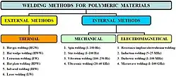 Plastic welding is welding for semi-finished plastic materials, and is described in ISO 472[1] as a process of uniting softened surfaces of materials, generally with the aid of heat (except for solvent welding). Welding of thermoplastics is accomplished in three sequential stages, namely surface preparation, application of heat and pressure, and cooling. Numerous welding methods have been developed for the joining of semi-finished plastic materials. Based on the mechanism of heat generation at the welding interface, welding methods for thermoplastics can be classified as external and internal heating methods,[2] as shown in Fig 1.
