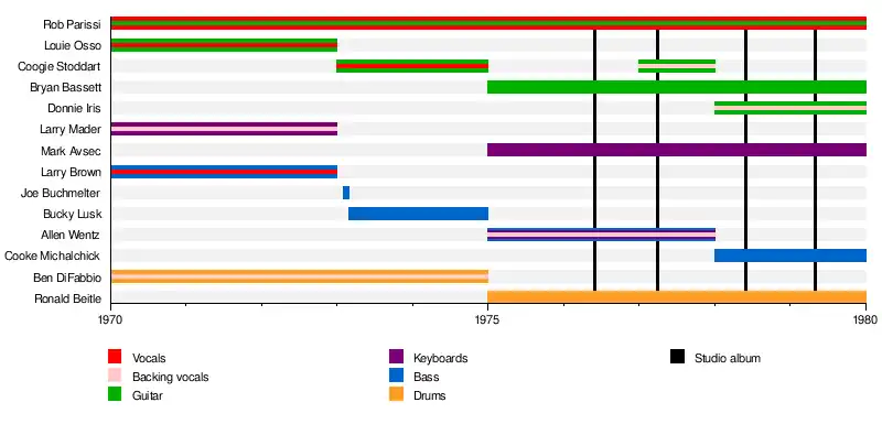 Rob Parissi (lead vocals and guitar) was raised in the steel-mill town of Mingo Junction, Ohio. He graduated from Mingo High School in 1968 and formed the band Wild Cherry in 1970 in Steubenville, Ohio.[3] The band's name, 'Wild Cherry', was taken from a box of cough drops.[4] The band played the Ohio Valley region, the Northern West Virginia panhandle, and Pittsburgh, Pennsylvania. The original lineup included Ben Difabbio (drums and vocals) and Louie Osso (guitar and vocals) from Steubenville, Larry Brown (bass and vocals) from Weirton, West Virginia, Larry Mader (keyboard and vocals) from East Springfield, Ohio, and Ron Vallera (guitar and background vocals) from Steubenville, Ohio. Over time, the band members changed; Osso, Brown, Mader, and Vallera left the band and were replaced by Parissi's cousin, Coogie Stoddart (guitar and vocals), and Joe Buchmelter (bass). Buchmelter was soon replaced by Bucky Lusk.