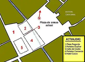 During the Inca period, the main square was larger than the current square because in addition to the current square (former Huacaypata) it occupied the entire area of the current Plaza Regocijo (formerly Cusipata), the "Hotel Cusco" and the blocks located between Calle Espaderos, Calle del Medio and Calle Mantas.[10] Precisely these blocks and the Calle del Medio were crossed by the Saphy River (currently covered and made sewer), which divided the square into its two sectors already known.[11] It was the religious and administrative center of the Inca Empire. As well as being the main axis of the Inca road.[12] Around the square were the palaces of Pachacuti, Huayna Capac and Viracocha Inca.[13]