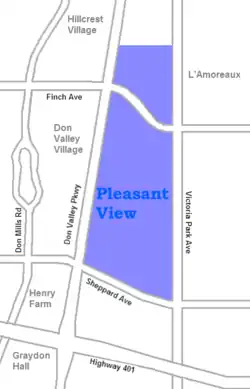 Pleasant View is a neighbourhood in the city of Toronto, Ontario, Canada that is located in the district of North York at the northern end of the city. It is bordered by Victoria Park to the East, Sheppard Avenue to the South, Highway 404 to the west and the Finch hydro corridor to the north (north of Finch Avenue). The neighbourhood is home to several high-rise apartment and condominium buildings, such as The Clippers.