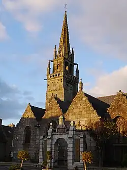 The Pleyber-Christ Parish close (Enclos paroissial) is located at Pleyber-Christ in the arrondissement of Morlaix in Finistère in Brittany in north-western France. The Saint Pierre church has been listed as a historical monument since 1914 and had been completely reconstructed in the middle of the 16th century commencing with the tower built in 1551.[1] It replaced an earlier church, thought to date to before 1400. The church has a magnificent central altar with the Rosary altarpiece to the left and the Saint Joseph altarpiece to the right. Statues of Saint Eloi and Saint Herbot stand at the entrance to the choir.[2][3][4]