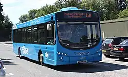 A few years later a black, red and white livery was adopted for all buses, but the black was eventually replaced by grey.[8] When low floor buses were introduced they were given 'Super Rider' branding.[20] Park and ride services were introduced using Mercedes-Benz minibuses in a mid-grey scheme[8] but the Dennis Dart MPDs that replaced them were given special green and yellow livery.[20]