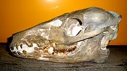 Poebrotherium looked more like modern camels than its predecessor Protylopus, but at 90 centimetres (3.0 ft) in height, it was roughly the size of a modern sheep. Its skull resembled that of a modern llama, while its limbs ended in hooved toes and were more built for speed than the feet of Protylopus. Despite this apparent adaptation to the open plains, Poebrotherium has been found in all major White River environments, including forests and river overbank deposits, indicating that it was not tied to one particular environment.[8] The teeth of Poebrotherium were more generalised than those of modern camelids.[9] In fact, despite the name meaning "grass-eating beast" it is likely that Poebrotherium was either a browser or a mixed-feeder, and grass may have played a minimal role in the diet of Poebrotherium.