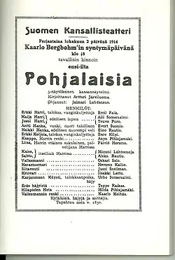 The play was first performed at the Finnish National Theatre in 1914 and directed by Jalmari Lahdensuo, who was also a well-known theatre director of the era.[1] Although Artturi Järviluoma is credited as the author, there has been ongoing debate over the extent of his contribution. The controversy centers around the role of Anton Kangas, a playwright and Järviluoma's former teacher, who died in 1904. Kangas had written an unfinished play called Härmäläisiä, which shares significant similarities with Pohjalaisia. Since the original manuscript of Härmäläisiä no longer exists, it is speculated that Järviluoma may have drawn heavily on Kangas's work.[8][9][10][11]