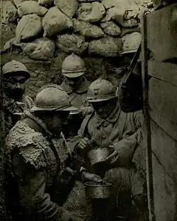 Poilu (/ˈpwɑːluː/; French: [pwaly])[1] is an informal term for a late 18th century–early 20th century French infantryman, meaning, literally, the hairy one. It is still widely used as a term of endearment for the French infantry of World War I. The word carries the sense of the infantryman's typically rustic, agricultural background, and derives from the bushy moustaches and other facial hair affected by many French soldiers after the outbreak of the war as a sign of masculinity.[2] The poilu was particularly known for his love of pinard, his ration of cheap wine.[3][4]