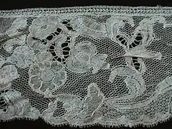 Brussels lace is a type of pillow lace that originated in and around Brussels.[1] The term "Brussels lace" has been broadly used for any lace from Brussels; however, strictly interpreted, the term refers to bobbin lace, in which the pattern is made first, and the ground, or réseau added, also using bobbin lace. Brussels lace is not to be confused with Brussels point (or Point de Gaze), which is a type of needle lace, though sometimes also called "Brussels lace".[2]