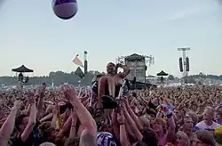 The festival was initiated in 1994 by Jerzy Owsiak after his trip to the United States where he attended the Woodstock Festival, which was held after a 25-year hiatus.[8] The festival's official motto is Love, Friendship, Music.[9] The event is held by the Great Orchestra of Christmas Charity as a way of thanking its volunteers. Generally a weekend-long event, its two stages are in continuous use from early afternoon to dawn, featuring performances by around 30 bands every year. Many Polish musicians and bands have made several appearances, including IRA, Decapitated, Myslovitz, Maria Peszek, Kamil Bednarek, Dżem, Acid Drinkers, Lessdress, Hey, Riverside, and The Analogs. International bands are also invited every year – Skunk Anansie, Sabaton, Judas Priest, Within Temptation, Shaggy, The Stranglers, Papa Roach, The Prodigy, Kaiser Chiefs, Ugly Kid Joe, You Me at Six, Guano Apes, Kontrust, Clawfinger, Nigel Kennedy, Gentleman, Korpiklaani among many others.[10] Festival promoters also aim to promote emerging talent – and a competition is held prior to the festival, and the winners are given a chance to perform at the festival. The main musical theme is generally rock, but genres range from folk through experimental to metal. Recent years have also seen reggae, electronic music and even classical music represented.[11][12][13]