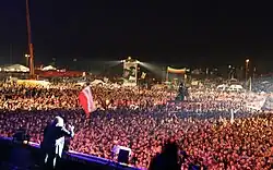 Pol'and'Rock Festival, formerly known as Woodstock Festival Poland, (Polish: Przystanek Woodstock; "Woodstock Station"; English-language materials often referred to it simply to the Woodstock Festival Poland) is an annual free rock music festival in Poland, inspired by the Woodstock festival. The festival has been held since 1995. In 2009, Woodstock Festival Poland gathered an audience of over 400,000 people,[1] in 2011, the attendance was above 700,000,[2] in 2012, about 550,000 people,[3] in 2013, about 500,000,[4] and in 2014, the attendance reached a record high of about 750,000.[5] As of 2019, the aggregate attendance of the festival is 750,000 making it one of the biggest music festivals in the world.[6][7]