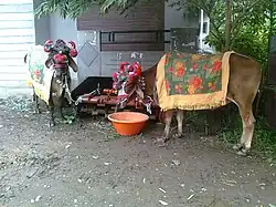 In preparation for the festival, bulls are washed and massaged with oils. They are decorated with shawls, bells, and flowers, their horns are coloured, and they get new reins and ropes. The decorated bulls and oxen are walked in procession to the village field accompanied by music and dancing. The first bullock to go out is an old bullock with a wooden frame (called makhar) tied on its horns. This bullock is made to break a toran, a rope of mango leaves stretched between two posts, and is followed by all the other cattle in the village.[2]
