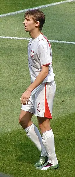 In Euro 2008 qualifying, Poland were drawn into a group with Portugal, Serbia, Finland, Belgium, Kazakhstan, Armenia and Azerbaijan.[94] Poland's campaign began in uncomfortable fashion, suffering a 1–3 defeat to Finland on 2 September 2006 and then drawing 1–1 with Serbia on 6 September.[95][96] In the third match, on 7 October, Poland won 1–0 over Kazakhstan, with Ebi Smolarek scoring the goal.[97] On 11 October, Poland beat Portugal 2–1, with Smolarek scoring the two goals.[98] Poland beat Belgium 1–0 on 15 November.[99] On 24 March 2007, Poland beat Azerbaijan 5–0, and on 28 March beat Armenia 1–0.[100][101] On 2 June, they beat Azerbaijan 3–1, with Smolarek and Krzynówek (2) scoring.[102] On 6 June, Poland lost 1–0 to Armenia, on 8 September drew 2–2 with Portugal, and on 12 September drew 0–0 with Finland.[103][104][105] On 13 October, Poland beat Kazakhstan 3–1 with a hat-trick from Smolarek.[106] They beat Belgium 2–0 with two goals from Smolarek on 17 November and drew 2–2 with Serbia in the final qualifying game on the 21st, thus qualifying for the tournament as the 1st place team in the qualifying group following Portugal's 0–0 draw with Finland. This was Poland's first ever Euro appearance.[107][108][109]