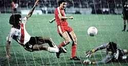 In the first game of the second round, Poland beat Belgium 3–0 with a hat-trick from Boniek securing a classic performance in the match, though the player would receive a yellow card in the following game.[25][26] Nevertheless, Poland advanced as group winners to the knockout stage.[21] However, Poland would eventually be stopped in the semi-finals, losing 0–2 to Italy; however, they also secured a place in the third place play-off,[27] where Poland beat France 3–2, with the game also being regarded as "the end of the golden era of Polish football".[28]