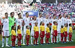 Poland's first match was with Northern Ireland on 12 June at the Stade de Nice in Nice; they won the game 1–0 with a goal from Arkadiusz Milik in the 51st minute.[152] The next match was with Germany at the Stade de France in Saint-Denis on 16 June; with the finishing 0–0.[153] Poland's final group game was with Ukraine on 21 June, at the Stade Vélodrome in Marseille, a game they won 1–0 with a goal from Jakub Błaszczykowski.[154] In the round of sixteen, Poland were drawn to play Switzerland on 25 June at the Stade Geoffroy-Guichard in Saint-Étienne. Poland took the lead through a goal from Błaszczykowski, but conceded a bicycle kick from Xherdan Shaqiri in the 82nd minute, finishing the game 1–1 in regular time. Poland then beat Switzerland in a penalty shootout, 5–4.[155][156] Poland then faced Portugal in the quarter-finals; another penalty shootout occurred after a 1–1 draw. Poland lost the shootout 5–3.[157]