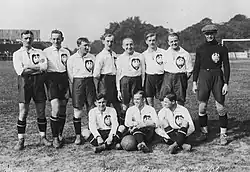 Poland played its first official international match on 18 December 1921 in Budapest, losing to Hungary 1–0.[9] Their first international victory came on 28 May 1922 when they took on Sweden in Stockholm and beat them 2–1. Józef Klotz scored the first-ever goal for the national football team in that game.[10][11][12][13][14] Poland qualified for their first World Cup in 1937 when they beat Yugoslavia 4–0 and lost 1–0 in the two qualifying matches and ensured their place in the 1938 World Cup in France.