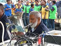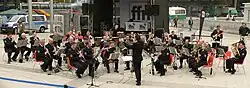 A police band is a military-style band operated or sponsored by a police force. Police bands provide ceremonial support for civic events, and perform at police observances such as funerals and police academy graduations.[1] Most police bands consists exclusively of professional police officers, while others consist of personnel of law enforcement and other special agencies. Like military bands, their repertoire is mostly composed of ceremonial marching music and honors music (national anthems and fanfares).