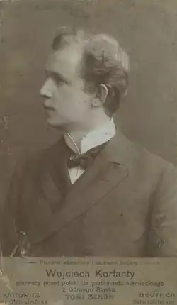 In the 1903 German federal election, the party ran seven candidates in seven constituencies: Wojciech Korfanty in Kattowitz-Zabrze, Jan Nepomucen Stęślicki in Beuthen-Tarnowitz, Józef Siemianowski in Lublinitz-Tost-Gleiwitz, Jan J. Kowalczyk in Pleß-Rybnik, Paweł Hanslik in Groß Strehlitz-Kosel, Piotr Reszka in Kreuzburg-Rosenberg and Józef Rostek in Ratibor. The electoral campaign was managed by Maksymilian Hanke. Contemporaries described the electoral mood as energetic, voting for PTW was seen as a rebellion from Germanization and admission to Polish identity.[1] During the electoral campaign, the Prussian police tried to arrest Korfanty and Kowalczyk for distributing illegal literature, but the judiciary rejected the Police's claims.[2] The party won 44 thousand votes, 35% of all votes in the constituencies they contested. Only one candidate, Wojciech Korfanty, won a seat, with 23,550 votes against 22,875 cast for his opponent, Paul Letocha.[2] Kowalczyk came close to victory, winning 47% of votes in the first round, but failing in the second.[1] After the election, Korfanty joined the Polish Circle in the Reichstag, being the first Upper Silesian in the Reichstag to do so.