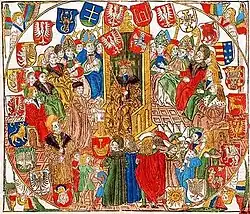 The most striking peculiarity of the system is that a coat of arms does not belong to a single family. A number of unrelated families (sometimes hundreds of them), usually with a number of different family names, may use the same, undifferenced coat of arms, and each coat of arms has its own name. The total number of coats of arms in this system was relatively low – ca. 160 (Piekosiński[35][36]) in the late Middle Ages.[37] The same can be also seen in Western Europe when families of different surnames but sharing clan origin would use similar coats-of-arms, the fleur-de-lis of the many Capetian families being perhaps the best-known example.