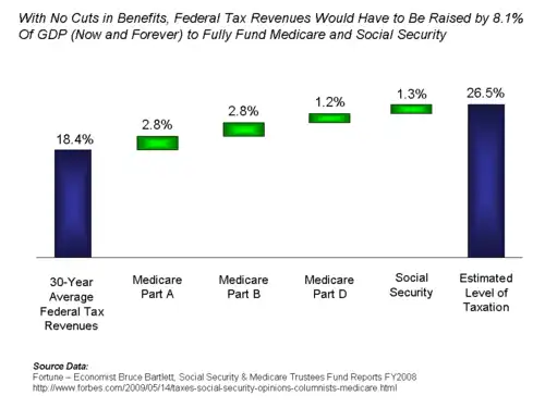 Political realities make major budgetary deals difficult to achieve. While Republicans argue conceptually for tax cuts for the wealthy and reductions in Medicare and Social Security, they are hesitant to actually vote to reduce the benefits from these popular programs. Democrats on the other hand argue conceptually for tax increases on the wealthy and a stronger social safety net. The so-called budgetary "grand bargain" of tax hikes on the rich and removal of some popular tax deductions in exchange for reductions to Medicare and Social Security spending is therefore elusive.[4]