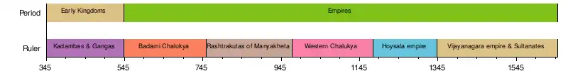 The political history of medieval Karnataka spans the 4th to the 16th centuries in Karnataka region of India. The medieval era spans several periods of time from the earliest native kingdoms and imperialism; the successful domination of the Gangetic plains in northern India and rivalry with the empires of Tamilakam over the Vengi region; and the domination of the southern Deccan and consolidation against Muslim invasion. The origins of the rise of the Karnataka region as an independent power date back to the fourth-century birth of the Kadamba Dynasty of Banavasi which was the earliest of the native rulers to conduct administration in the native language of Kannada in addition to the official Sanskrit.