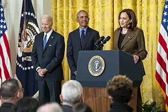 Harris supports abortion rights, and reproductive health care was central to her presidential campaign.[8][9] She has been called "the Biden administration's voice for reproductive rights"[10] and "the White House’s voice of unflinching support for reproductive health rights."[11] Several abortion rights and women's organizations supported her after Biden withdrew from the race, with Reproductive Freedom for All saying "there is nobody who has fought as hard [as Harris] for abortion rights and access" and EMILY's List calling her "our most powerful advocate and messenger" on reproductive rights.[12]