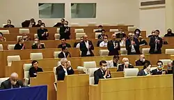 In foreign policy with Russia, the government sought to de-escalate conflict with Russia and normalize relations by promoting "Peace Through Trade" and diplomatic engagement. In November 2012, Prime Minister Ivanishvili appointed special envoy for relations with Russia, Zurab Abashidze (diplomatic relations between the countries remained formally broken). In December 2012, Georgian and Russian diplomats met in Prague to discuss problematic relations between the countries first time since the end of the 2008 war. This became known as "Abashidze–Karasin Format". In June 2013, Russia lifted the embargo on Georgian wine. Georgia resumed wine exports to Russia for the first time since 2006.[56] The policy reduced the risks of military conflict, although tensions remained high as Georgia continued Euro-Atlantic integration and territorial disputes remained unresolved. In 2019, there was a wave of protests and demonstrations against the government caused by the visit of Russian communist MP Sergei Gavrilov to Georgia. The Russian delegation visited Georgia in the framework of the Interparliamentary Assembly on Orthodoxy session planned to be held in the Parliament of Georgia. Russia and Georgia, both Orthodox Christian nations, are part of the Assembly. During the session, Sergei Gavrilov, the President of the Interparliamentary Assembly, sat in the chair reserved by protocol for the Head of Parliament and gave a speech in Russian about Orthodox brotherhood of Georgia and Russia. Gavrilov had previously voted in favor of the independence of Abkhazia. The protest, which worsened after an attempt to storm the parliament building and violent dispersal by special forces, led to Georgian Dream pledging electoral reform and to hold the next year's parliamentary election under a fully proportional system.[57] In November 2019, Parliament's failure to pass the promised constitutional amendments (caused by opposition to the amendments by some internal factions within Georgian Dream[58]) led to a parliamentary boycott by the opposition and a political crisis.[58]