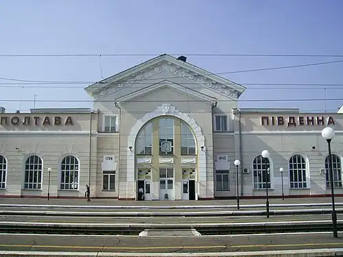Poltava-Pivdenna (Poltava-Southern, Ukrainian: Полтава-Південна) is a railway station in Poltava, Ukraine. The station is a railway node of four lines and is the main station of the Poltava Directorate of Southern Railways. The station was opened along with the Poltava — Kremenchuk Line on 1 August 1870, and currently houses 3 maintenance depots, as well as a number of technical and administrative facilities.